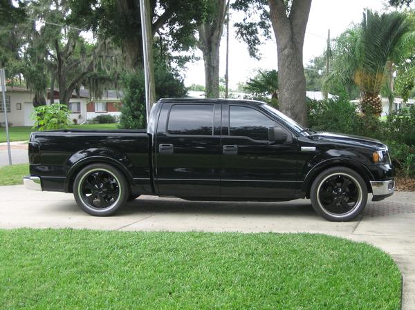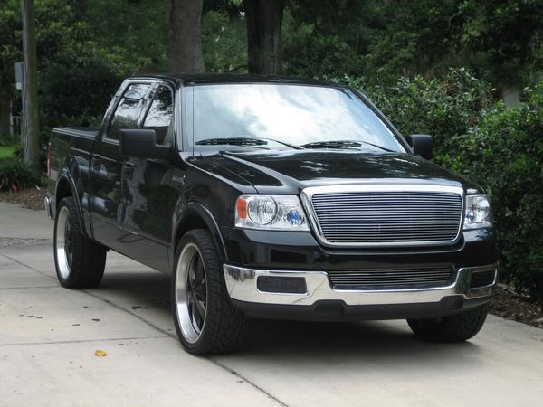 Black with smoked tail and 3rd brake lights, 06 F-150 Harley headlights, trenz upper and lower billet grill painted black, roush raceing front bumper, real smooth roll pan, HID 1000K headlights and 8000K fog lights, double 5% tint all the way around and 30% windsheild tint.