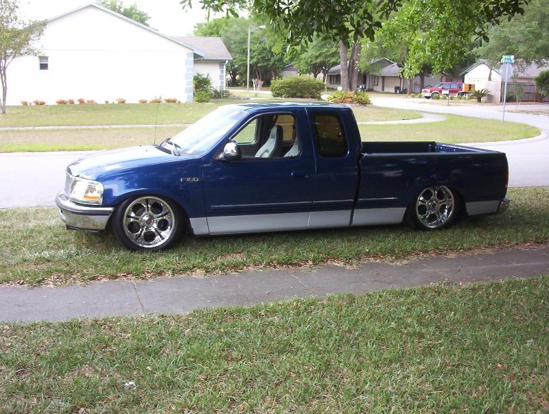 KP components 6-link cantilever with panhard bar, slam specialties bags, 2 Chassis tech 3/4 horse compressors, 8 1/2" Danz gold valves, 6 Gallon chrome tank in bed abd 7 gallon tank mounted to frame under the bed, djm lower control arms and custom drive shaft