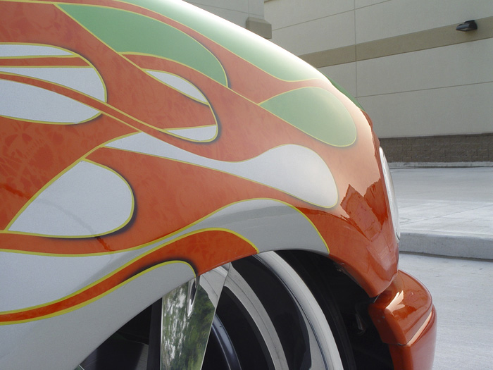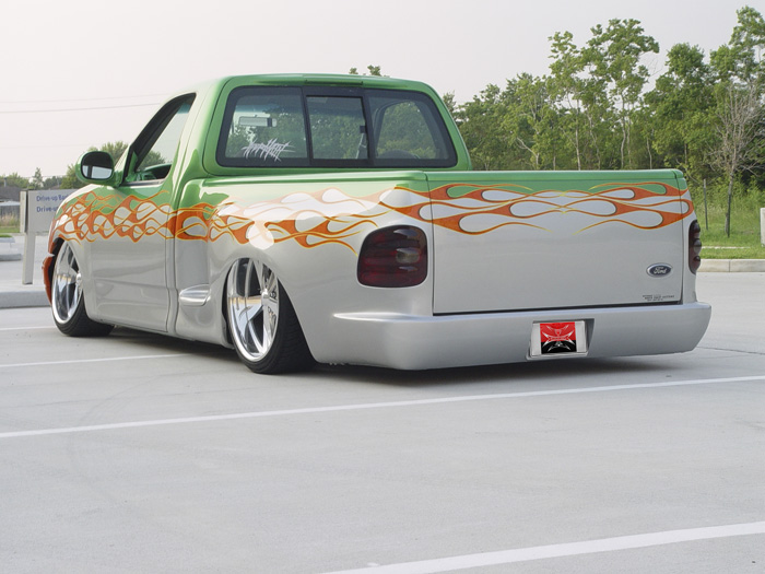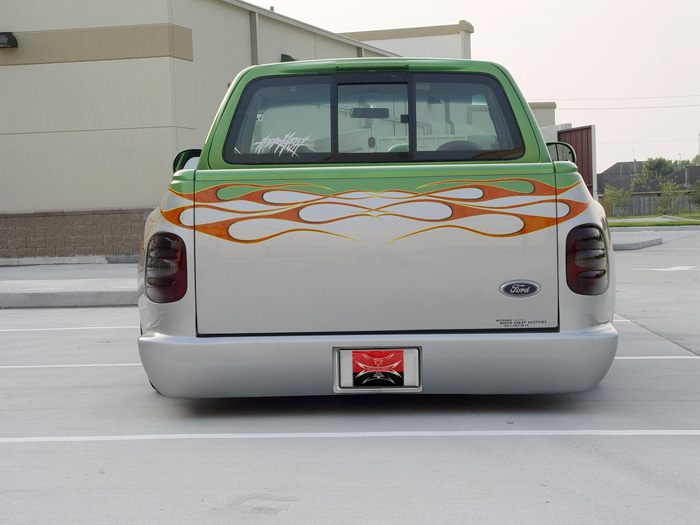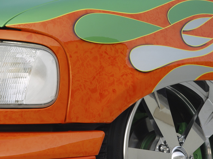 **FOR SALE**House of Color,tangelo flames with kandy orange ghost skulls inside of flames. Finished with yellow pin stripine seperating House of Color Lime Time Pearl and color matched stock silver. Shaved doors, tailgate, fender emblems,antenna,gas door, Molded Sir Michales roll pan. Street Scene smooth steps .....SOUTH COAST KUSTOMS...SOUTH HOUSTON TX..713-946-2747 WWW.SOUTHCOASTKUSTOMS.COM