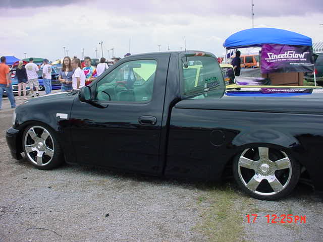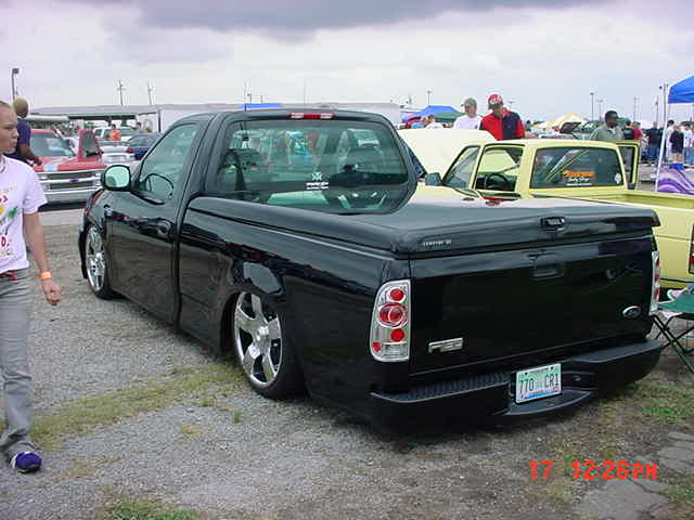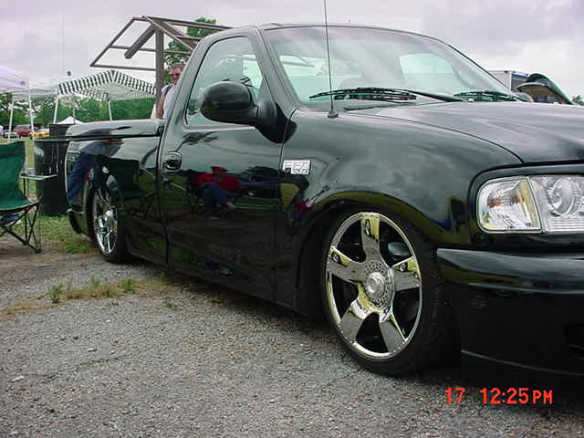 ball joint flip (thx to KUSTOMWERKS eric and matt are the poo)air ride tech. cool ride kit in front 2500 lb. bags k.p. componets cantilever 4-link in rear with 2600 lb. bags m.i.c. mass flow manual gauges viair 450c compressor with 5 gal. tank