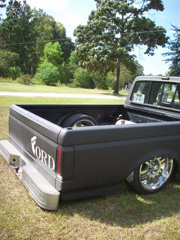 shaved tailgate and logos, flat black, famous ford logo, license plate in back window