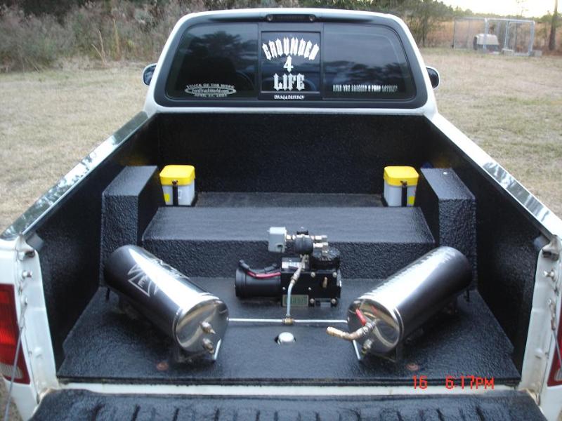 3&1/4" stock floor body drop to the rockers, kp components cantiever 6 link with custom panhard, DJM upper and lower control arms with MOOG ball joints, 2 etched 5 gallon stainless steel tanks, steel hardline in the bed, 10 switches, 8 ODE 3/8" valves, 1/2" line, firestone 2500 & 2600# bags, oasis hp1000 compressor on 2 optima yellowtop batteries, 3 pod pillar gauges, etc etc...