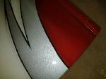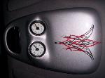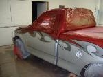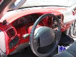 billet steering wheel, chopped seats, everything painted and covered in red, and gray
