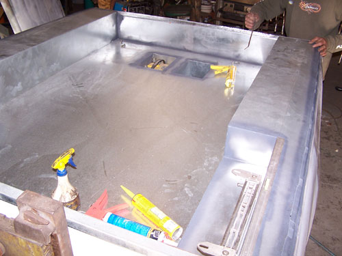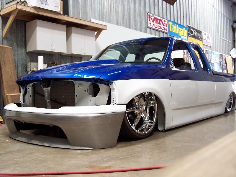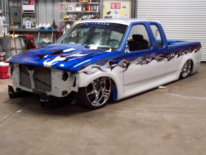 molded on tail, raised bed floor, sick ass one off bumper by bob grant. paint:ford white.dupont vivid blue effect. Flames: black traditional, overlayed with ghost chrome, spun to make it look like spun aluminum, flame work done by cosmic airbrush.