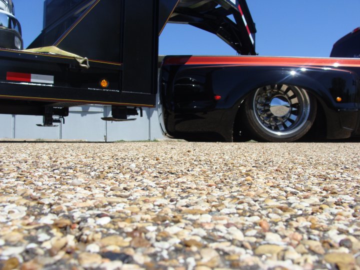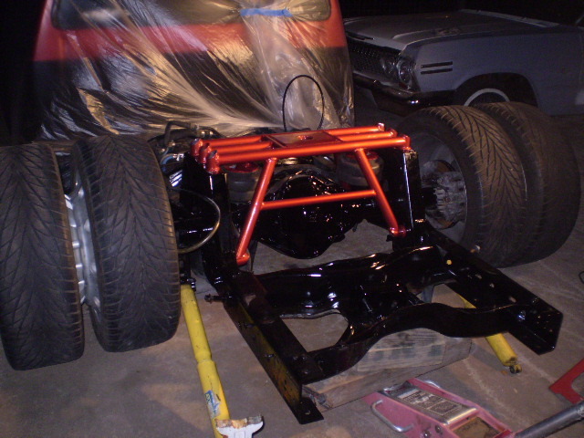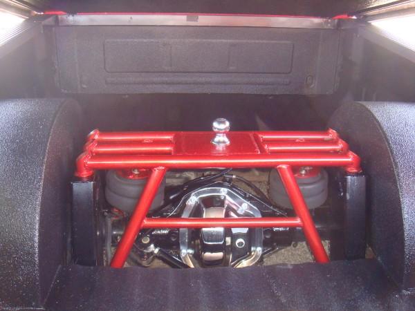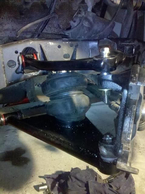 CUSTOM TWO LINK IN THE REAR WITH BAGS OVER AXLE. C NOTCH CUSTOM MADE GOOSE NECK HITCH. CHEVY SPINDLE WITH CUSTOM UPPER AND LOWER CONTROL ARMS. CUSTOM STEERING MADE WITH HEIMS AND CUSTOM CROSSMEMBER FR LOWER CONTROL ARM MOUNTS WITH HE-8 ENGINE AND TRANS HAVE BEEN RAISED 3.5 INCHES(PICS COMMING SOON)