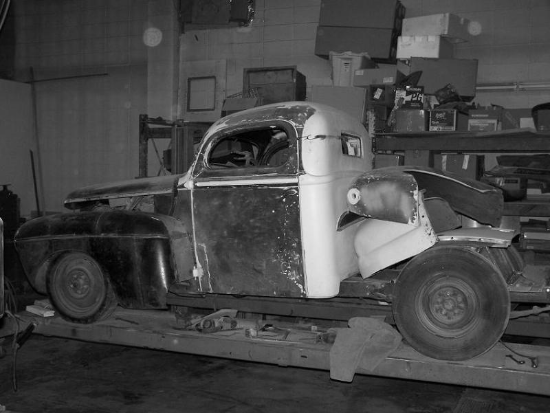 41 Merc car front fenders. 47 Ford pickup front fenders fliped on back. Cab chopped 5 inches.