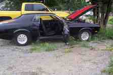 flat black with flat red racing stripes, just ordered new bumbers for it, putting them on this friday (7-22-05), and all i need until it is finished are the little chorome pieces that go around the sides of the gril like on the front fenders