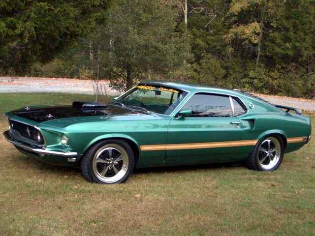 428 SCJ (Super Cobra Jet) engine, with a solid lifter cam, received ported and polished Edelbrock heads, and a one-off serpentine belt system. (juiced with NOS) 400+hp at rear wheels!Exhaust consists of 2½" jet hot coated mandrel bent steel tubing and dual Flowmaster mufflers. Engine compartment completely rebuilt as a "free-air" design with 2.5 inch tubing prividing all of the support. Engine was sanded smooth and paitned to match exterior.