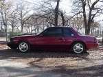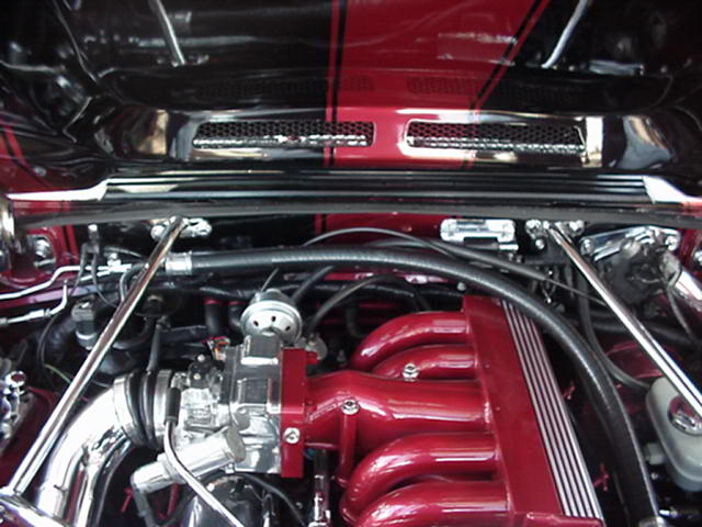 Strawberry metallic with black pearl racing stripes. The stripes go over the core support, under the hood, down the firewall, through the headliner, under the trunk lid. Everywhere the stripes follow