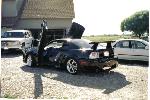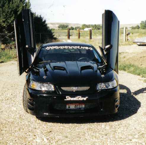 jet black lambo doors, kaminari full body kit, painted to match mack 2 hood painted to match cobra r wing painted to match rear lights projector head lights full street glow undercarage neon kit its blue to match interior, stainless mustang name in rear, custom break light reads out last name,