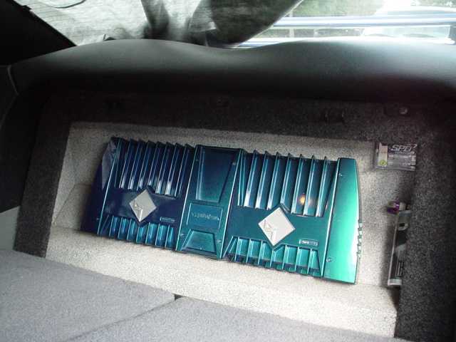 Premier 840,Premier 6 disc changer. RF punch 225.2 and RF punch 160.4 (both painted in PPG mediterrean blue). Qlogic kick pods w/ RF Fanatic X 5.25 components. Doors have Kicker 5x7 2 ways(no rear fill). Lightning Audio wiring,fusing,cap. JL audio 10w3 v2 (d4) in ported enclosure. Ungo Security.