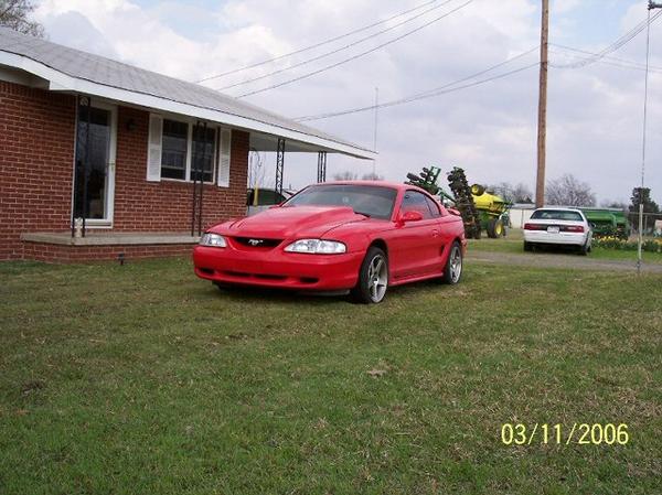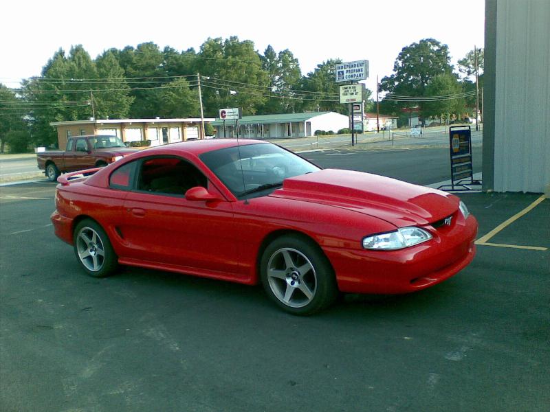 Custom red (not sure what color it is exactly), diamond clear headlights & corner lights, euro tails, custom tint job, Cobra RR cowl hood.