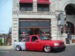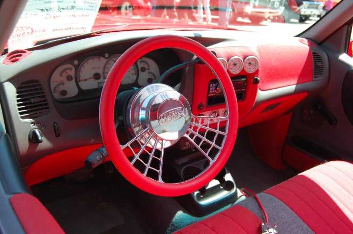 1ST GEN S-SERIES BENCH SEAT, VARIOUS PARTS COVERED IN RED AND GREY TWEED, COLORADO CUSTOMS BILLET CRAWLEY STEERING WHEEL WITH RED LEATHER HALF WRAP, APC WHITE FACE GAUGES, NU IMAGE A/C PANEL, CHROME PLATED A/C KNOBS, ONE-OFF BILLET WEBBED DOOR SILL PLATES, 3 KP AIR GAUGES GLASSED INTO RADIO BEZEL.