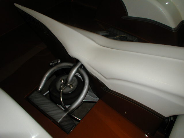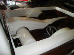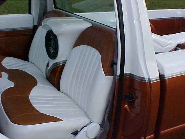 full custom fiberglass dash (with zero gauges), custom door panels, custom seats with (fake) ostrich skin inserts.