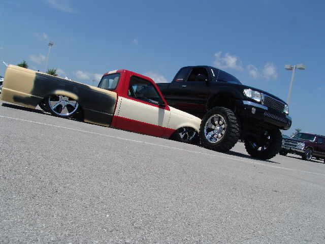 8 s.m.c's 3/8 dump,1/2 lift,all 1/2 line.2 450's 5 switchs,custom cross-members cant'i rev. set-up on the rear,pullin 12"s of lift..replaced front i-beams with '99 ranger IFS - new frame from firewall to rear of cab - front crossmember sectioned 2.5" - motor lowered 2.5"....5.75" total bodydrop