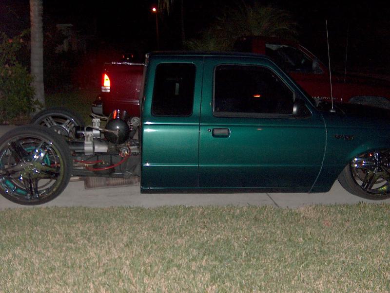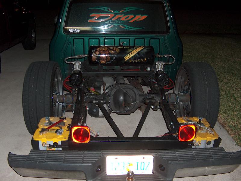 FBSS Have Slambags all the wat around- RE7 up front and RE8 in the rear... Custom Cantilever in the rear, Custom 3 link w/ Custom shackel, 2 Blow Jax compressors w/9 gal tank, Custom painted w/ the Juggernaut Air Brushed on tank....