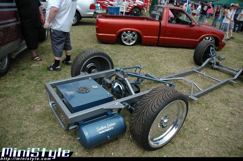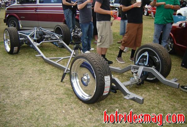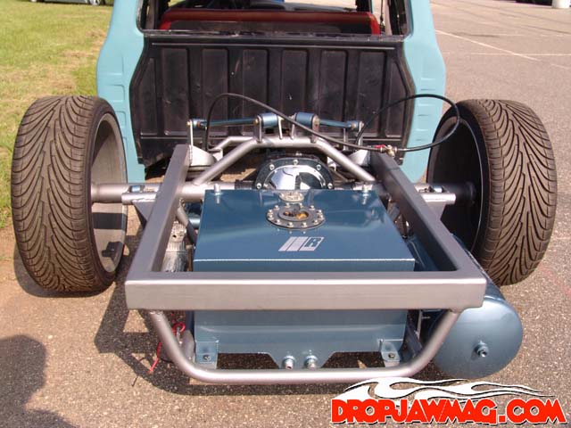 Bumper to bumper 2x3 frame, one off front suspension using Toyota spindles and a Mustang rack, Triangulated 4 link, Rear suspension and front suspension changes by Little Shop of Horrors