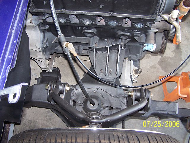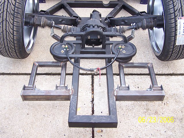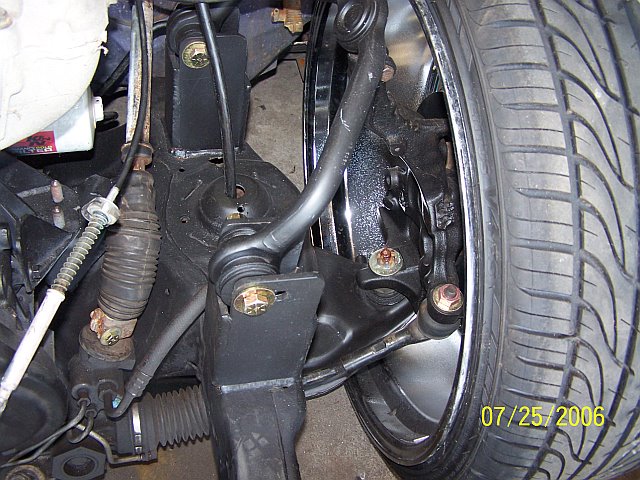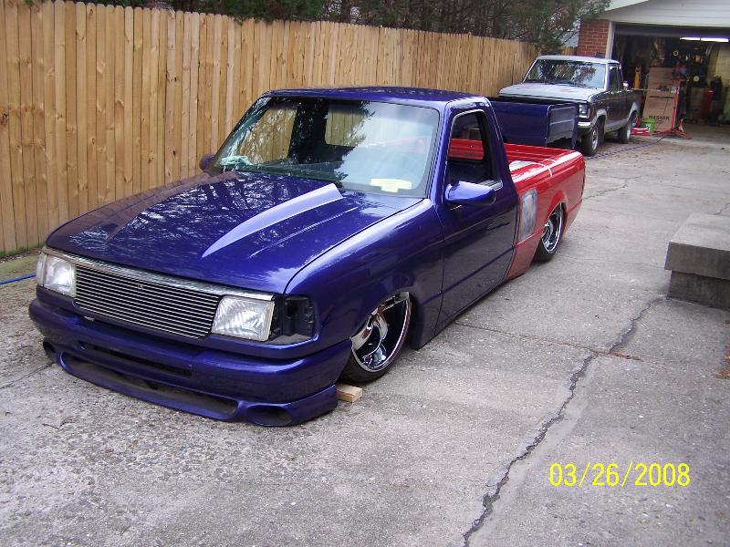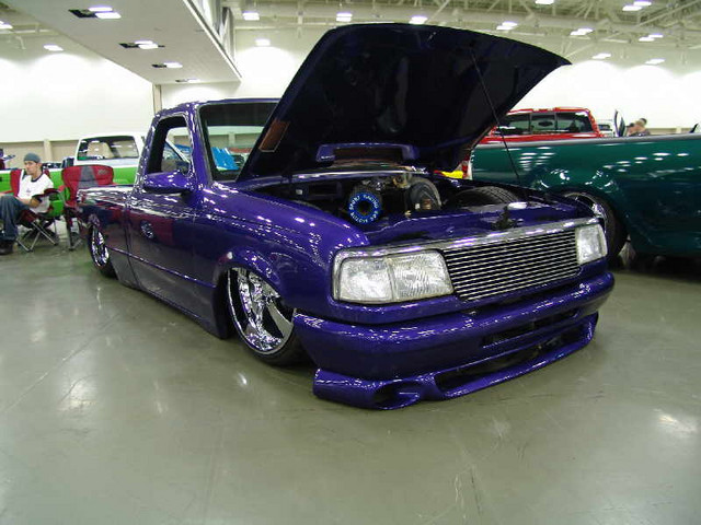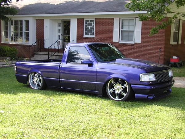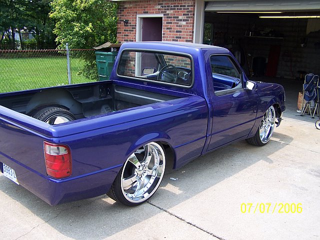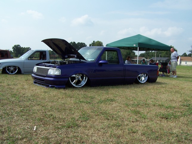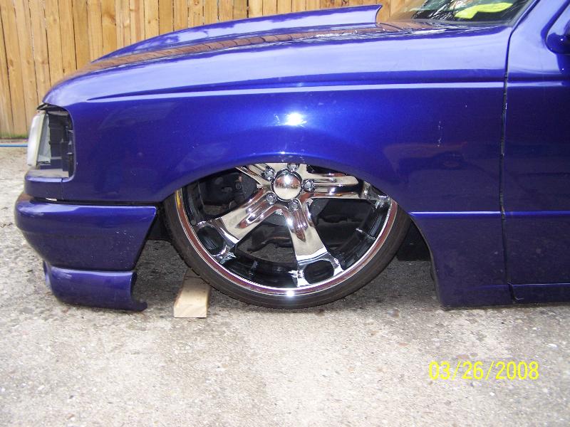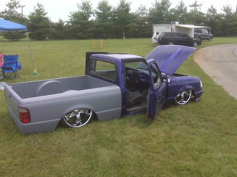 3.5 in. stock floor bodydrop, 98 ranger front clip, raised upper control arm mounts, new frame from the firewall. Nissan 300zx rearend. Lowered the engine 1.25in. Setup for 22s all the way around. All suspension work done by owner and