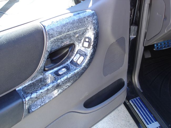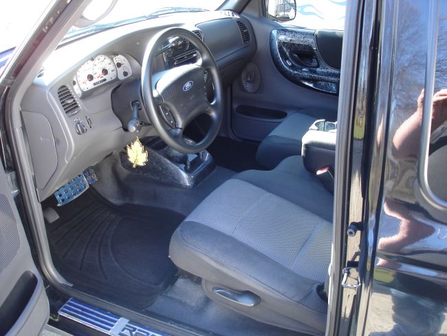 Painted some trim pieces and console in white marble effect paint courtesy of Robbies Airbrush. Tremor white face-guages, stock black/charcoal 60/40 seats, rubber floor, added some floor mats, billet AC -control, power mirror/window switches and polished plate around AC - controls, 20% tint with blue flames tattoo.
