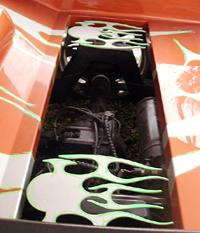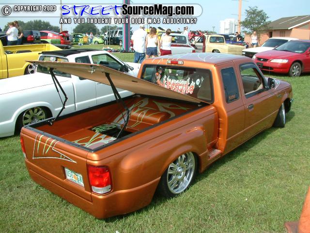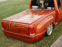 orange with custom gfx and insane custom bed with gfx and a gfxed topper laser cut free standing flames shaved tail gate handle tag box molded roll pan shaved gas door
