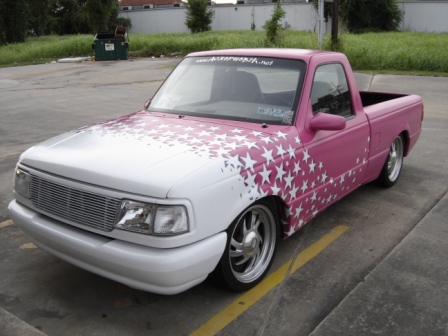 shaved emblems,doors,antenna,3rd brake lite, body seam on back of cab, & stake holes,full skin combo w/ frenched plate, crystal headlites, clear corners, billet grill , street scene mirrors, ppg magenta basecoat white stars and baby blue pinstrippin.