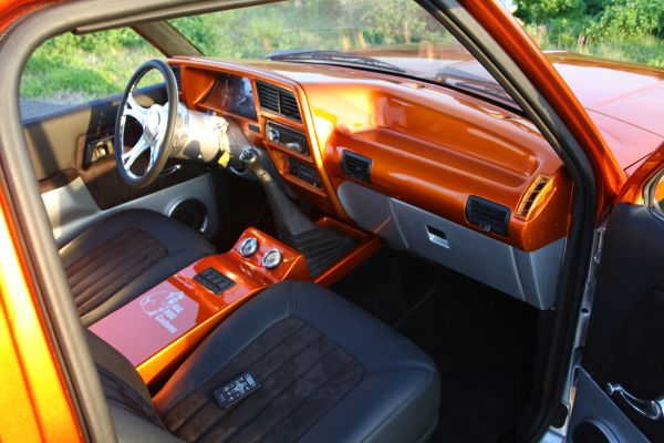 Painted and Leather and suede, fiberglass center console.billet rear view, window cranks, steering wheel