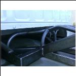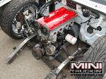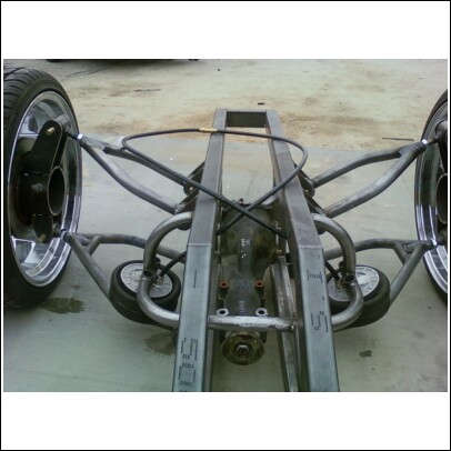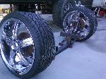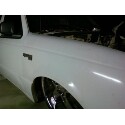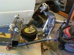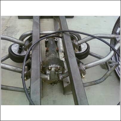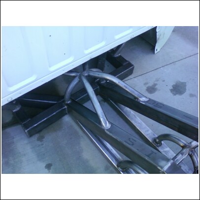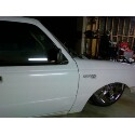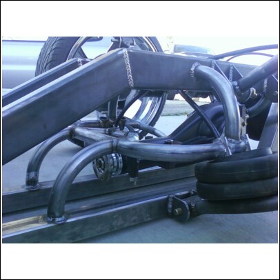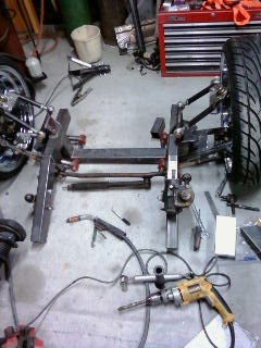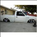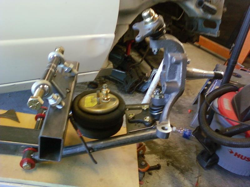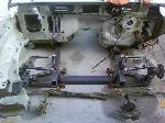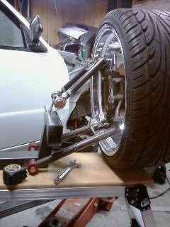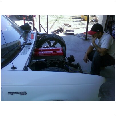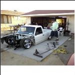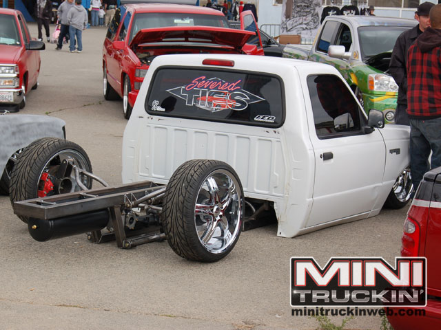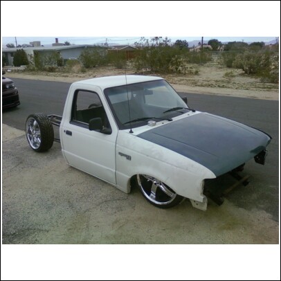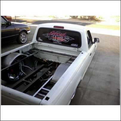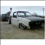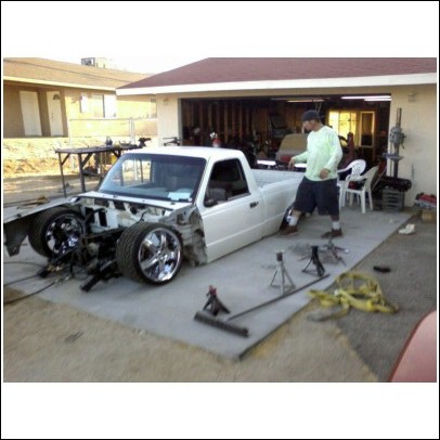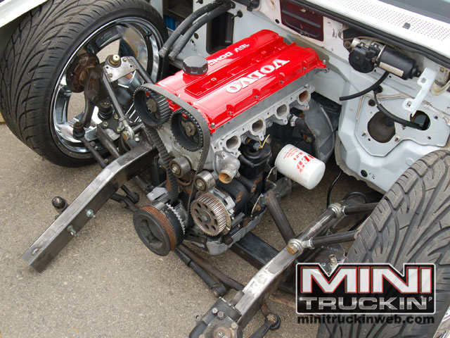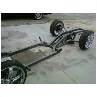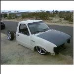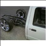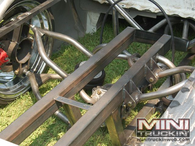 6 inch slams, new cross member built to toyota specs to narrow out the frame. homeaid chromoly control arms, toyota steering linkage. Subaru indipendent rear differential. WHAT???, look out.... Homemade rear spindels. Full frame. 3 in. Stock floor body drop. All steel fabrication and engine work performed by Scott Barker at SB Fabwerxs in 29 Palms California. For contact, check out his StreetSource. 'sbfabwerx'