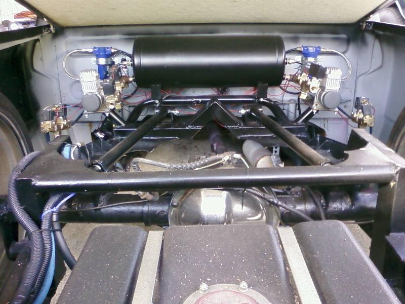 rear - bags on bars, contitech 2500's 3/8 inch, sd 4 link, 2 viair 380's, 1 satin black 4 port 5 gallon tank, 2 water traps, ptc fittings, all 3/8 line, 6 1/2 inch danz valves, 4 in front for fill and dump, 2 in the rear for fill, 3/8 smc dumps in rear. rear bags direct ported