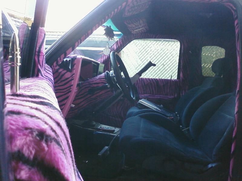 *SOLD* painted pieces, removable steering wheel, machete shifter, pink w/ black zebra stripes short hair fur interior, 1991 saturn bucket seats, swirled crush velour headliner (black), avs 7 switch rocker clear switchbox