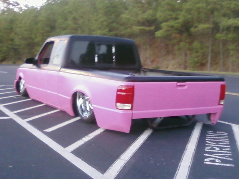 *SOLD* traditionally bodydropped 4.5 inches, 2004 ranger edge front clip, shaved drip rails, cab seams, door handles, antenna, emblems, 3rd brake light, stake pockets, smoothed wiper cowl, candied the tail lights. top - satin black. bottom - satin watermelon pink