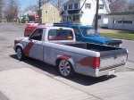 Sunset Pearl & Vanilla, Shaved: emblems, tailgate handle, stake pockets, 3rd brake light, antenae, gas door, Custom made steel cowl induction hood (5"), Widened front fenders, smoothed front and rear bumpers, 5" Body drop
