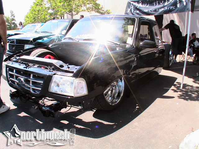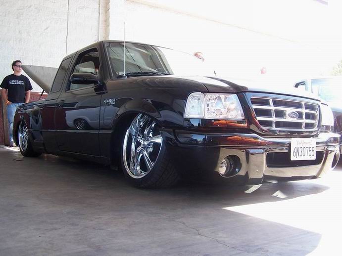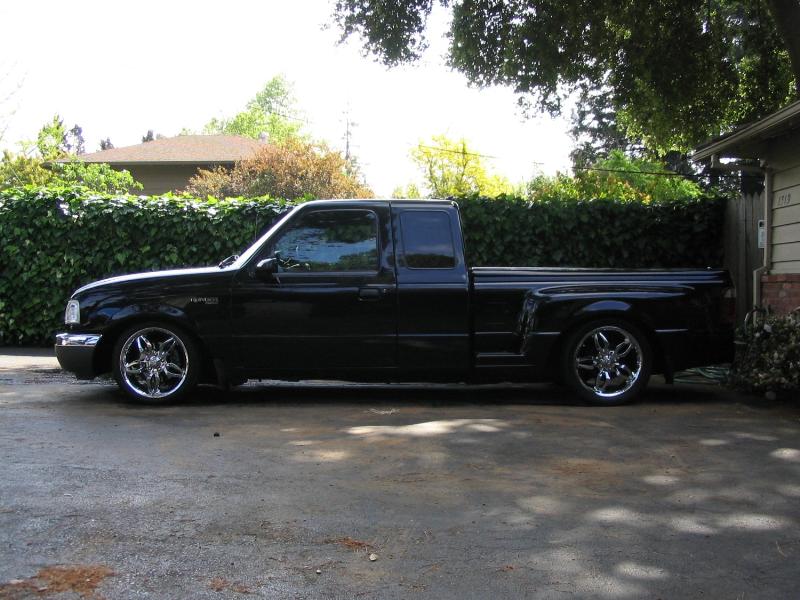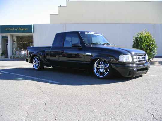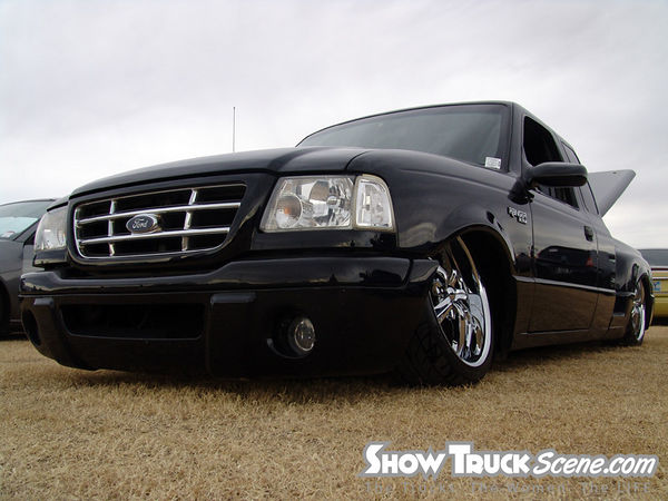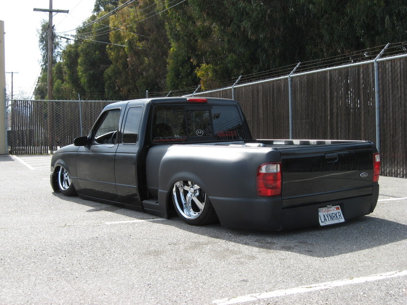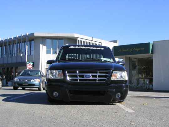 Eli @ Air Concepts Fab did a Stock Floor on a Powder coated frame. Raised bed sides, Sheeted bed, Shaved Handles, Grant Customs Roll pan, SS mirrors, clear corners, Edge Hoo, Bumper, and fog lights...Lots-A-shades of black!
