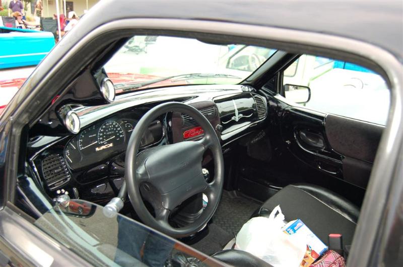 Dash smoothed and painted black, pinstriping on air bag cover and grant steering wheel seats wrapped in emu and leather with dash accented in black emu.