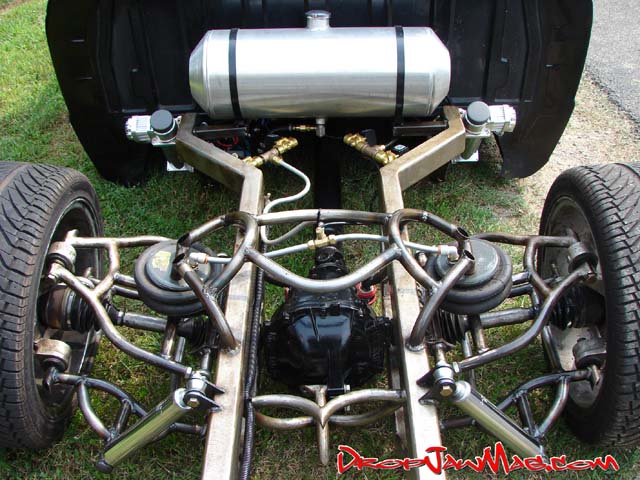 ssd front bag kit, tranny, radius crossmember, half clip with tank frame with 1989 thunderbird super coupe independent rear suspension. chrome shocks, 8 1/2 blackmax, 2 viair 450, 10 switch box, 150 pressure switch, 2 viair dual needle guages