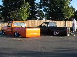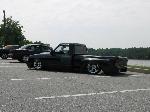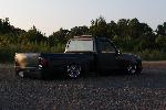3" I-beams, Toxic shocks,Firestone 2500's on all 4 corner's, 4-15mm SMC valves-lift and 4-10mm SMC valves-dump, 1/2" lines, 2-5 gallon tanks, 2-VIAR 450 compressors,10 switch box, bag on bar 4 link setup, home-made 2x4 step notch, home-made tranny X-member and radius arm relocators./ 3" body drop\---7" of lift up front and 14" out back