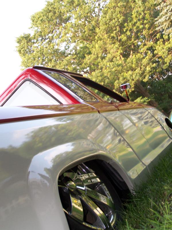 SHAVED HANDELS ,ANTENNA ,STAKE POCKETS,THIRD BRAKE LIGHT ,TAILGATE SHAVED WELDED SHUT ,TWO TONE PAINT ,BIG ASS COWL HOOD ,aluminum fuel cell, and sum other shit but who cares it drags and thats all that matters!