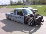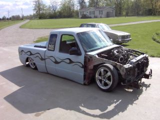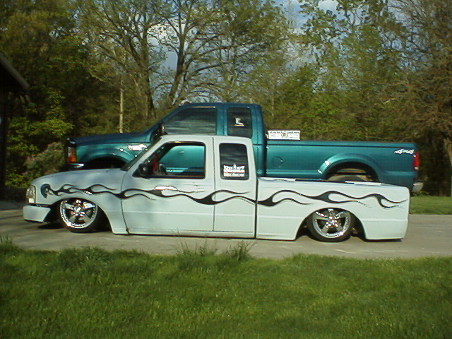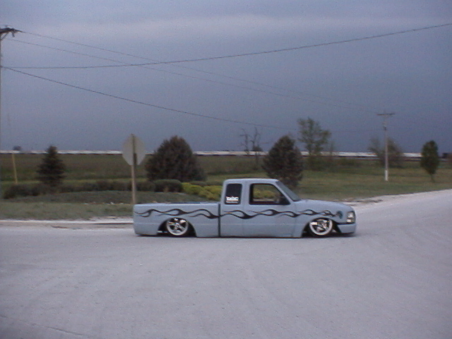 everything except 3rd brake light and mirrors shaved. Full tailgate skin with caddy lights. smooth bed floor. primer with flames, 2000 front end and cab