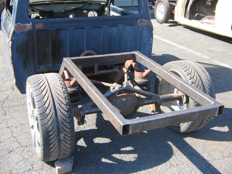 S-10 front cilp, S-10 rearend, 2X3 square tubeing, frame airtank, RE-8 all four corners, disc brakes all four corners, 1/2 danz valves,