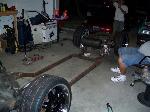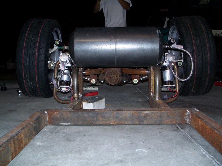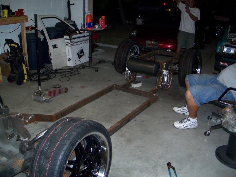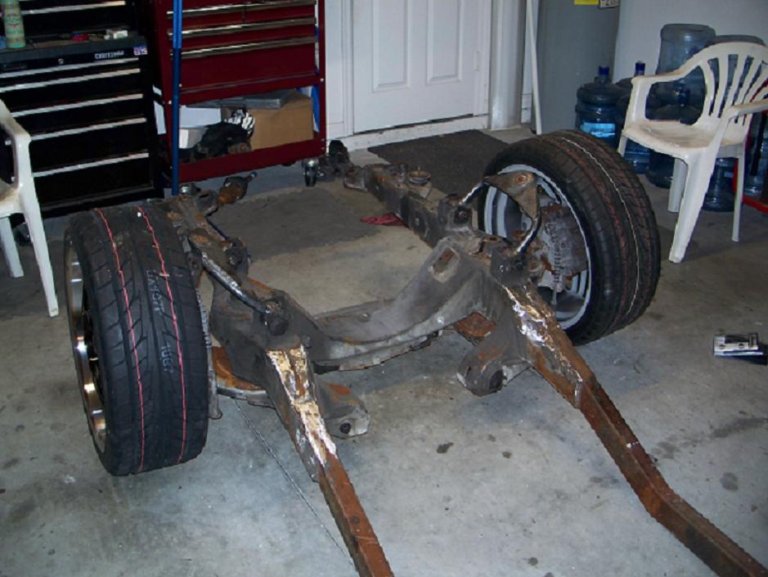 air of course.frame from firewall back to a thunderbird irs, and modified djm lowers up front(and djm uppers).cutting all the front crap off and rebuilding with mustang2 goodies