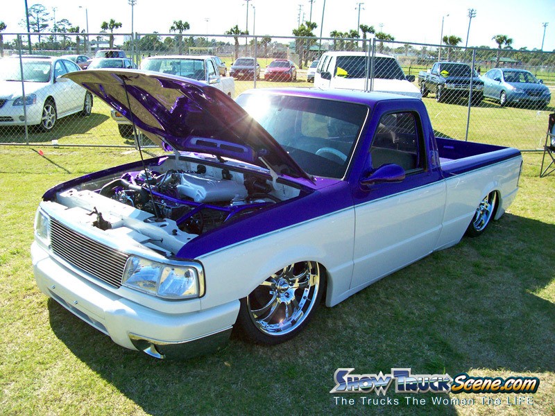 Shaved doors and tailgate, stake pockets, and molded rollpan, billet grille and Explorer sport bumper, painted violet pearl custom, and the new caddy pearl white