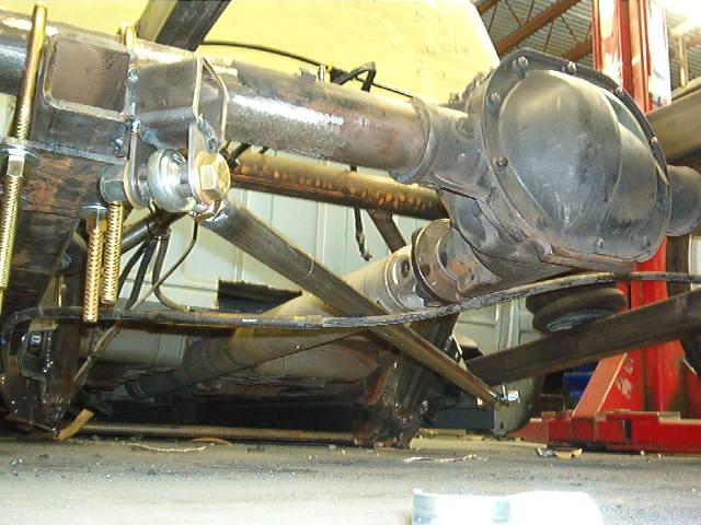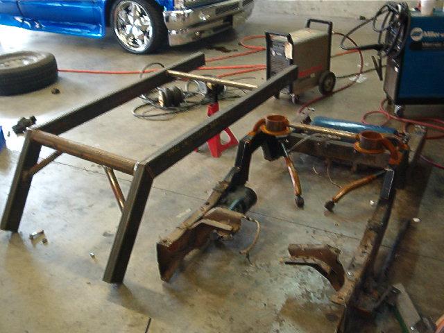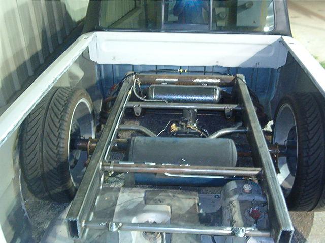 Air ride, 1/2" everything, 6 gal. for front, 3 gal. for rear, 3/4 hp compressor,1/2" aluminum hardline, 2 1/2" zeed front clip, new frame from firewall back, 2-link with z-link, mustang gas tank in rear