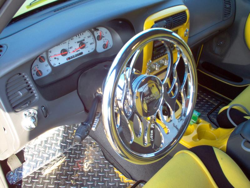 Custom race bucket seats (Yellow & black) 1 off billet hub adapter w/ colorado customs flame steering wheel, billet interior accessories, custom console, Pioneer stereo system, etc.