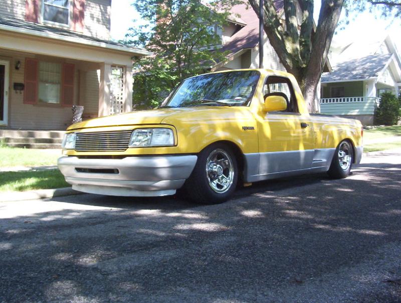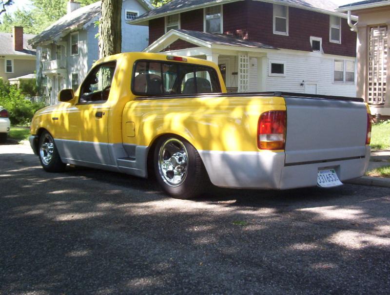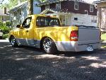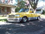 yellow and silver 2 tone paint, Sir Michael's steel roll pan, shaved door moldings, shaved and relocated tailgate handle, shaved tailgate emblem, billet grille, crystal clear headlights, clear corner lights