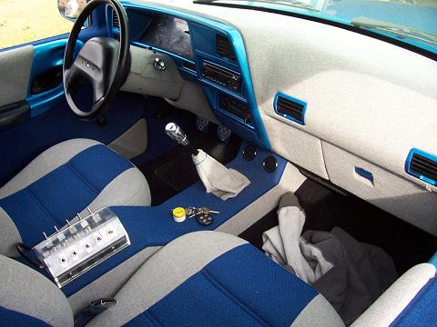 Kenwood head unit, Power Acoustik highs, Clarion 5 by 7 mids, and 1 Kicker XPL sub powered by a MTX Road Thunder 220 watt amp