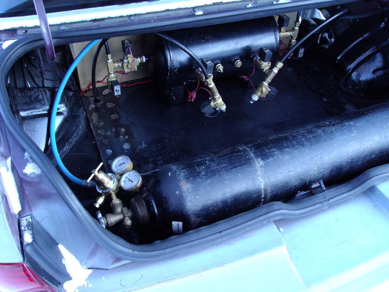 The rear has a stock modified IRS. Notched rear UCA's, 6" Slam bags, 3/8" SMC valves, a big ass Nitrogen bottle and an AVS 7 rocker switch box