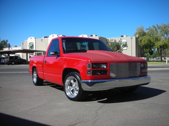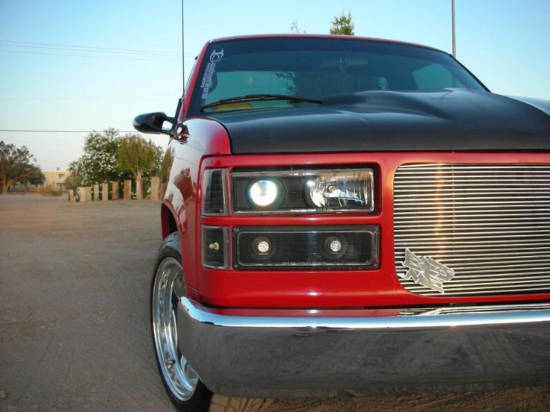 Projector Headlights(black background)with 10k H I D covertion,LED brake lights, 3'4' drop from belltech, 31 bar hi dens. Billet Grill, New front smoothie bumper, and a 2inch cowl hood