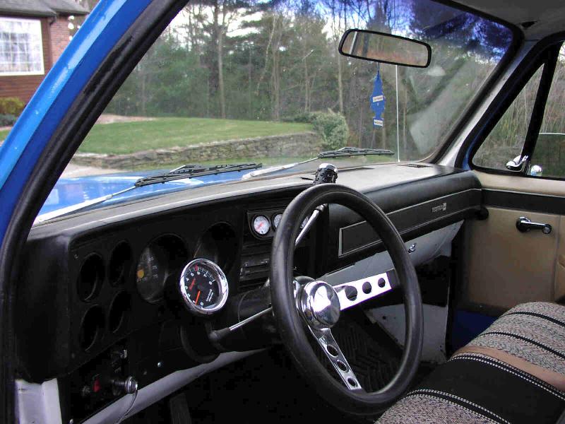 black vinyl seat with grey veloir inserts, black carpet, chevy bowtie floor mats, painted the interior blue, new dash pad