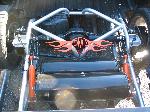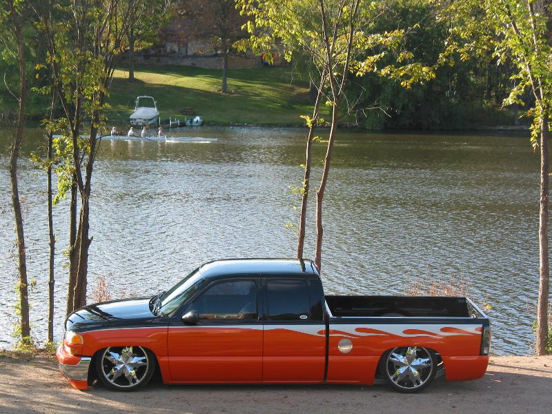 Shaved Doors, tailgate handle, emblems, molded rolepan. billet grill. House of Kolor Tangelo Pearl, shimerin silver flames, jet black. Kandy Burple stripes