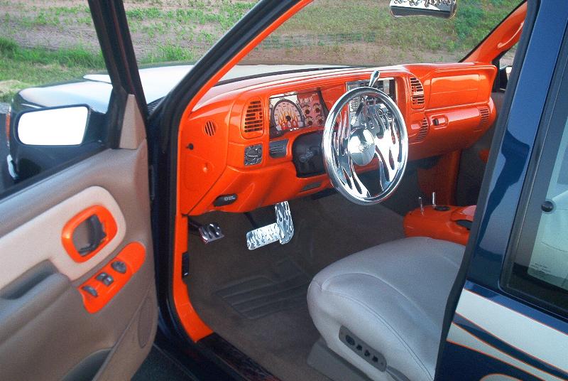 Fully smoothed & painted Tangalo Orange Pearl with custom leather seats, B.A.D. Inferno steering wheel & door sill plates, & lots more billet.