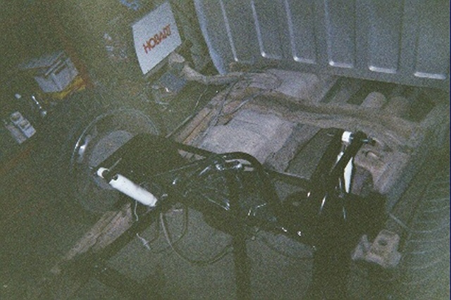 4-link over the axel, custom crossmember, 6 1/2" valves, 2 5 gal tanks, 2 VIAIR 380's, 3/8" hard line, 4 firestone 2600's